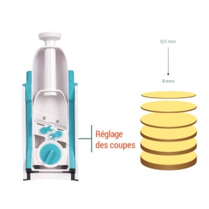 Cette mandoline offre de multiples possibilités de coupes : en tranches, en juliennes, en bâtonnets et en dès avec une épaisseur réglable allant de 0,5 mm jusqu’à 8 mm pour régler l’épaisseur des tranches.